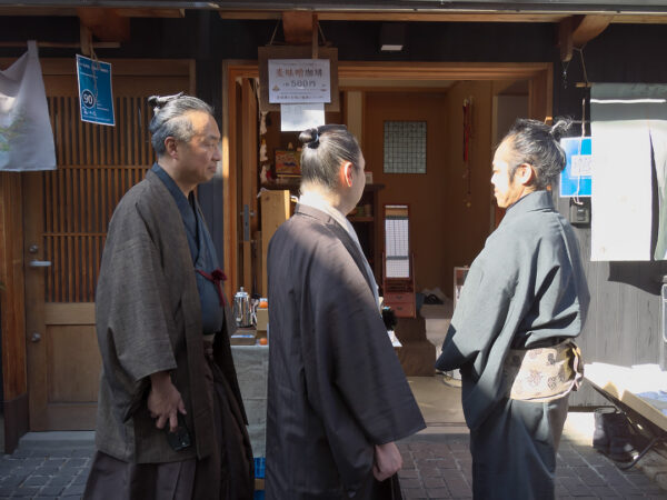 道を歩いていたら臨時出店されているご店主(右)が髷を結われていることに気が付きました。